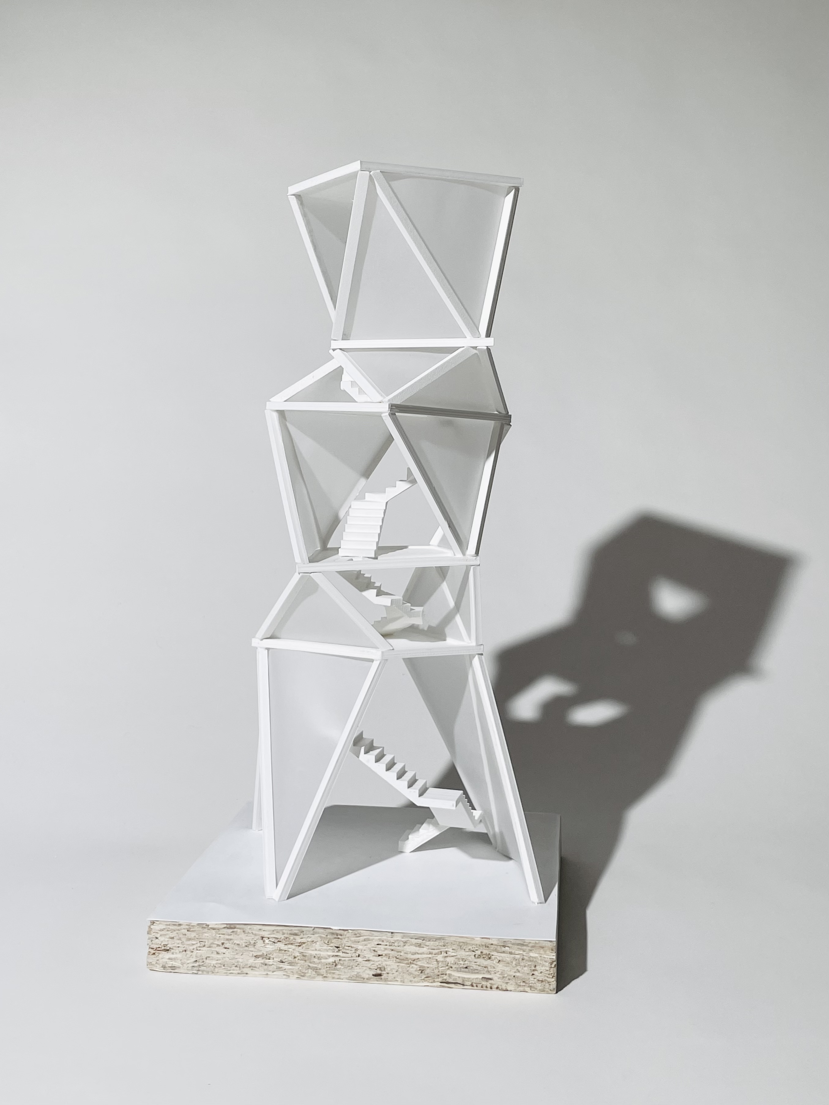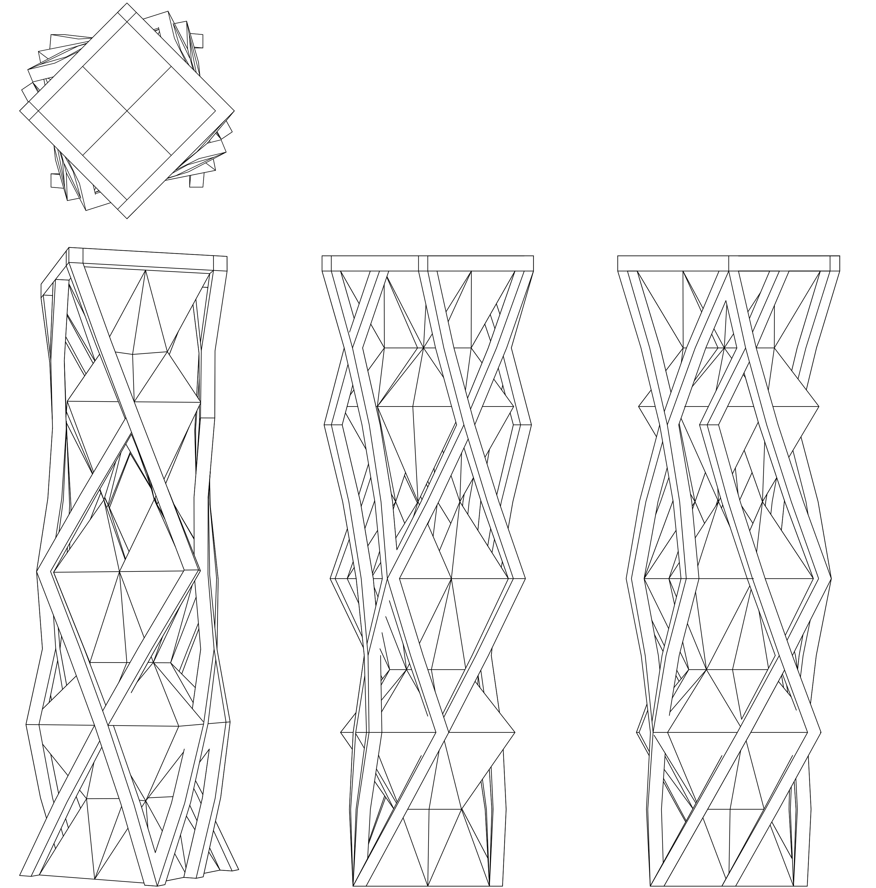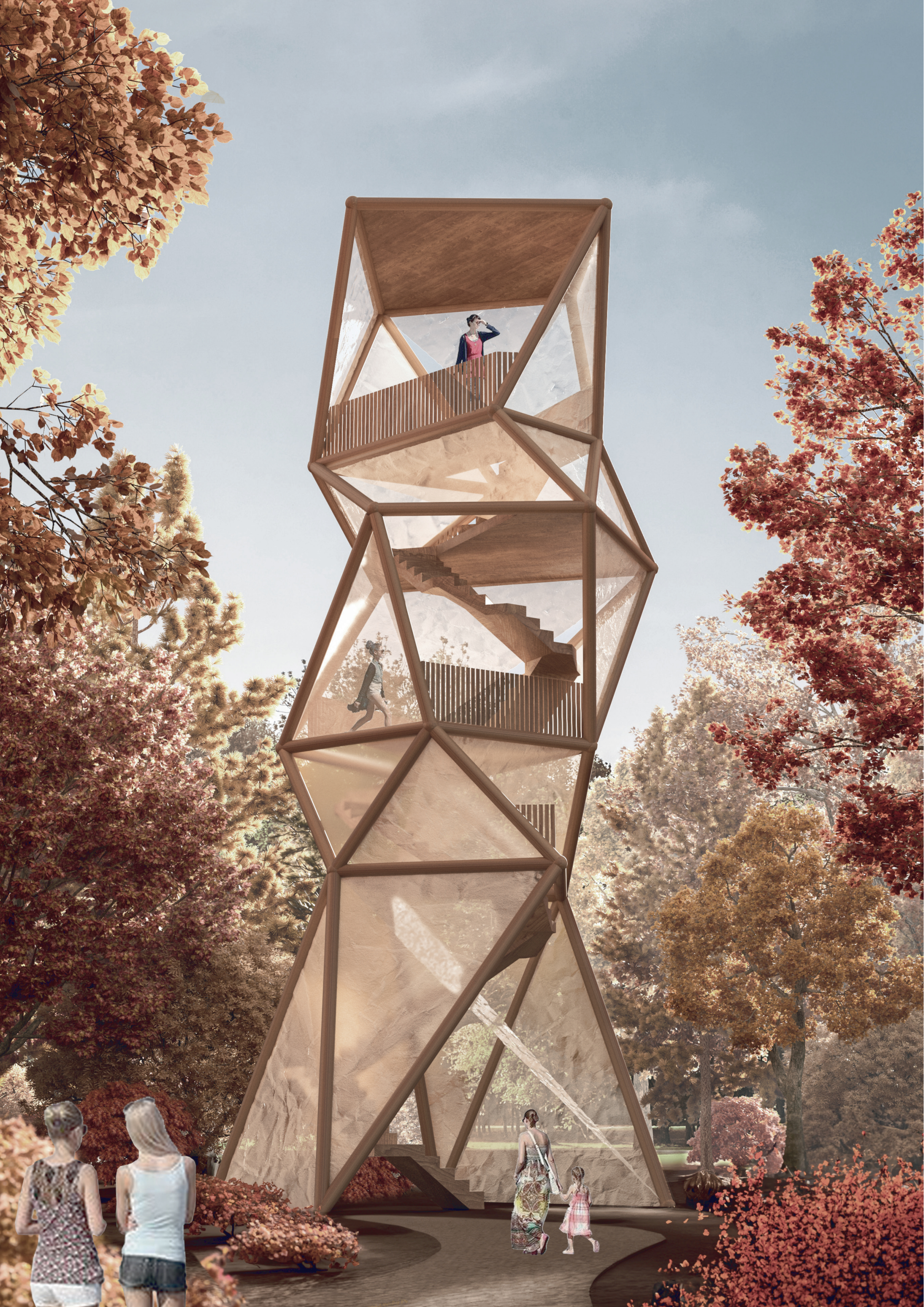Klare und kristalline Strukturen definieren den Turm. Das innere Gerüst bilden sich in die Höhe entwickelde, rautenförmige Volumen. Das äußere Gerüst wird durch Stäbe definiert, die sich entlang der Kanten und Ecken der inneren Volumen in die Höhe entwickeln.