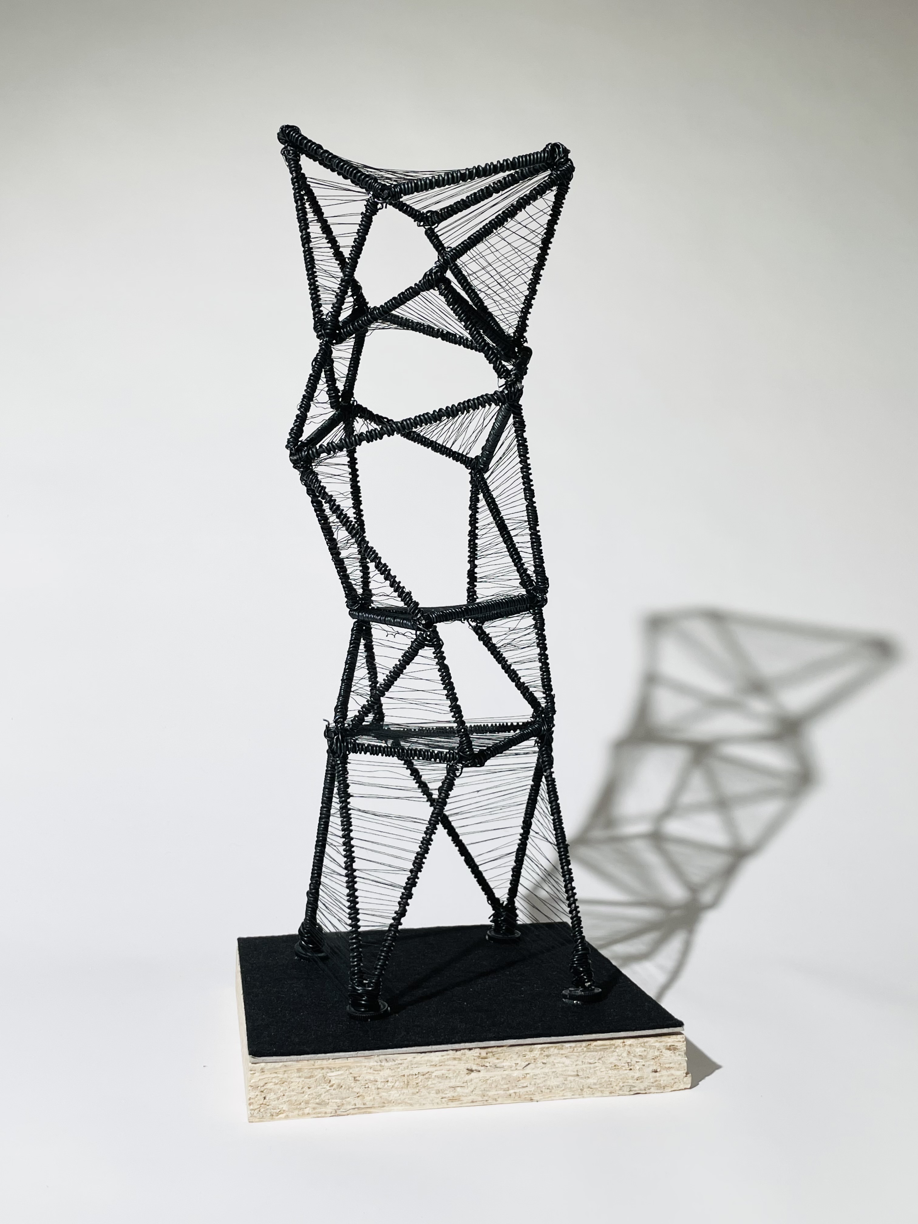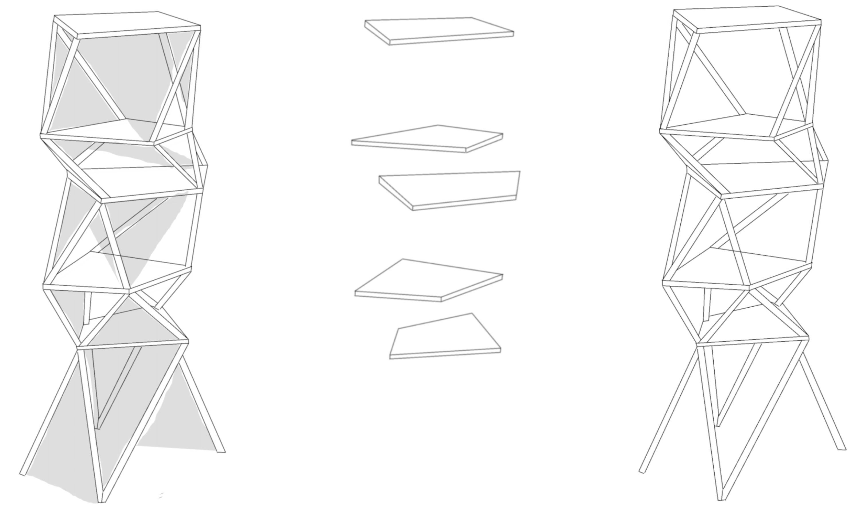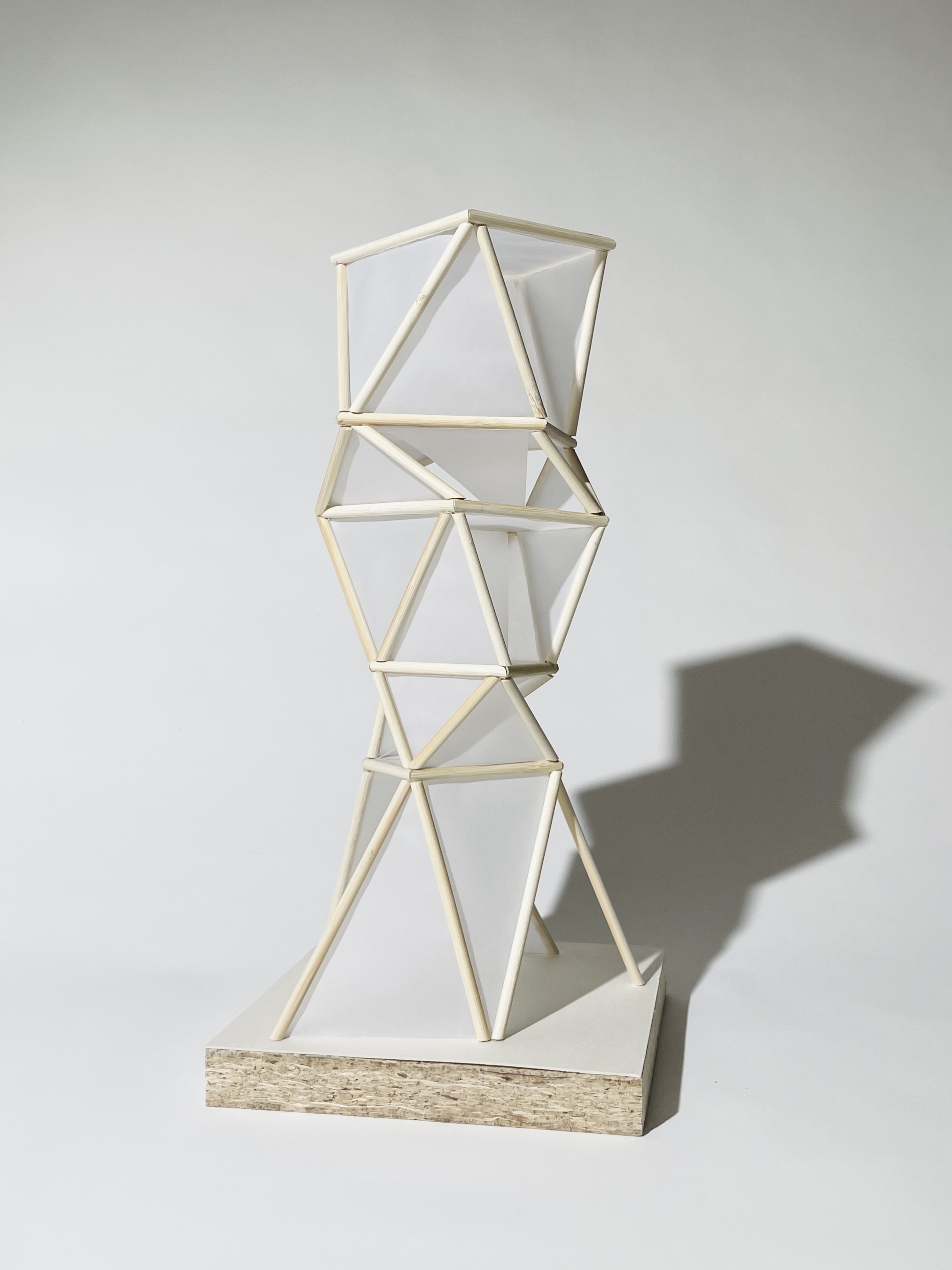 Klare und kristalline Strukturen definieren den Turm. Das innere Gerüst bilden sich in die Höhe entwickelde, rautenförmige Volumen. Das äußere Gerüst wird durch Stäbe definiert, die sich entlang der Kanten und Ecken der inneren Volumen in die Höhe entwickeln.